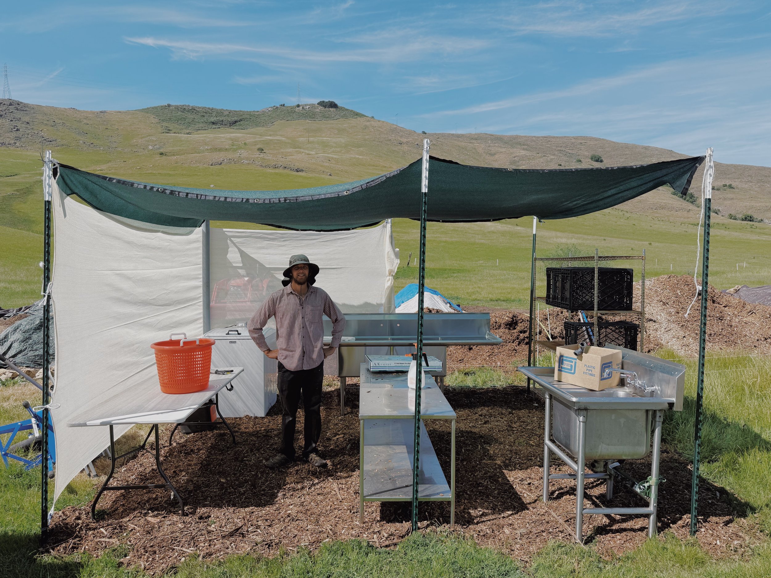 Jake built a simple shade structure to get us started, and we’ve been piecing things together from there, tracking down stainless steel sinks (one for dunking produce, one for sanitizing bins), setting up drying space, and even converting a washing machine to spin salad greens (a classic farm hack) so they last longer. A root washing table is next.